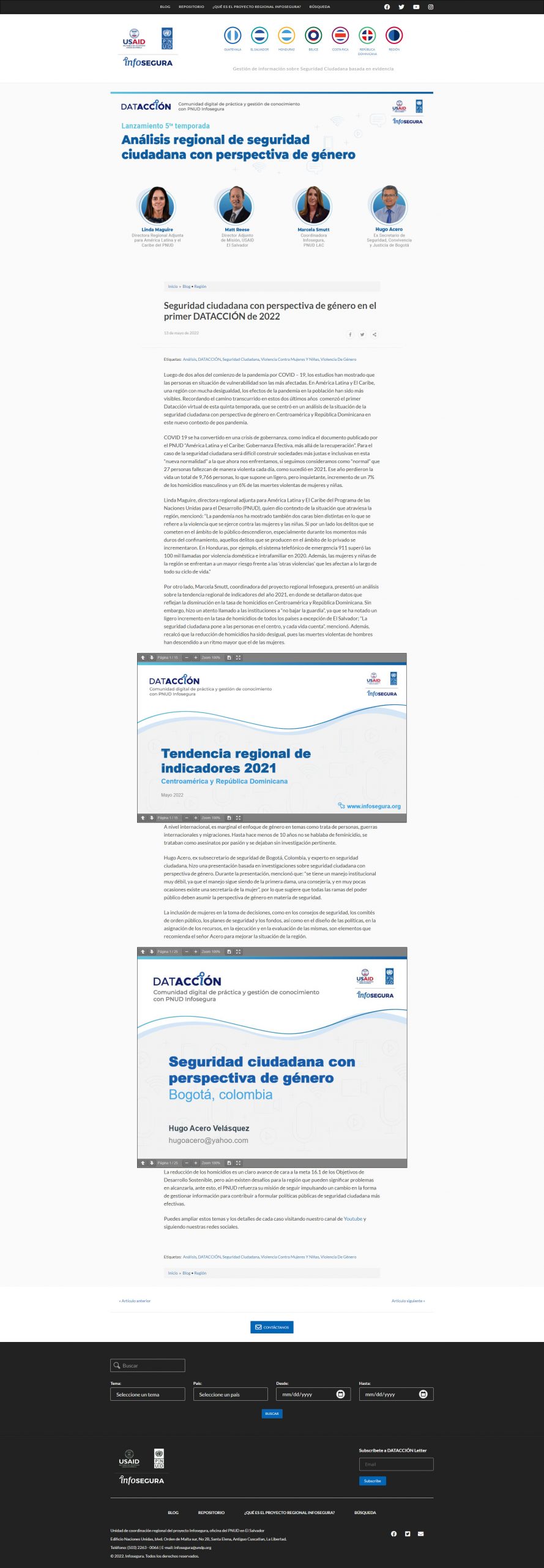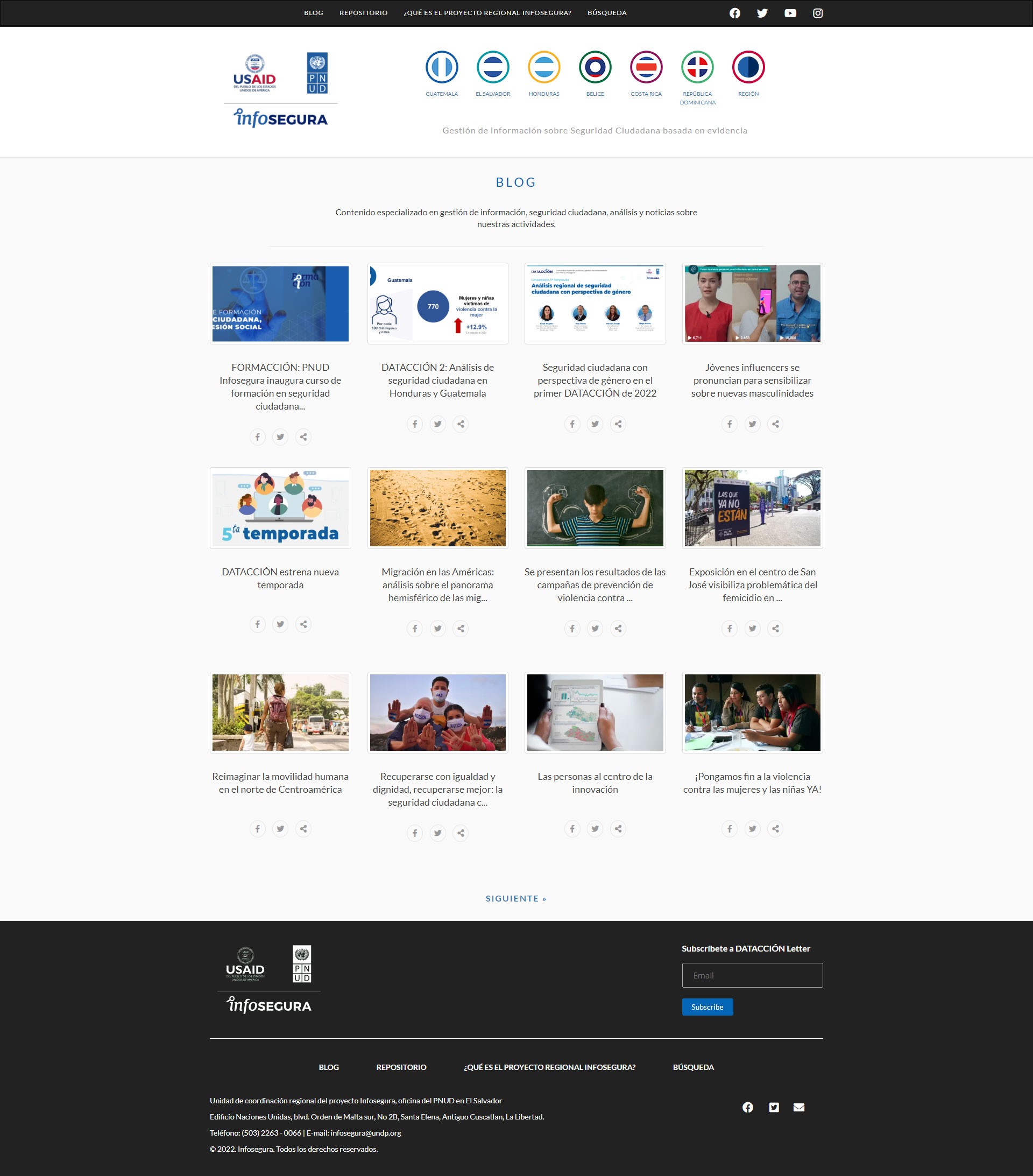«Infosegura es un proyecto regional especializado en la gestión de información basada en evidencia para fortalecer la formulación y el seguimiento de políticas públicas en materia de seguridad ciudadana en América Central y República Dominicana. Trabajamos parar mejorar la calidad de la información en seguridad ciudadana en la región, promover su análisis y uso como insumo para la política pública e incrementar la coordinación y colaboración regional en estrategias estatales de seguridad ciudadana»… +Information